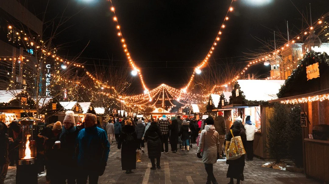 A man smiling and standing at a festive outdoor night market decorated with string lights, with other people browsing stalls and a snow-covered roof in the background.
