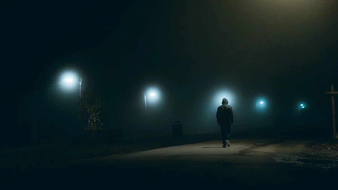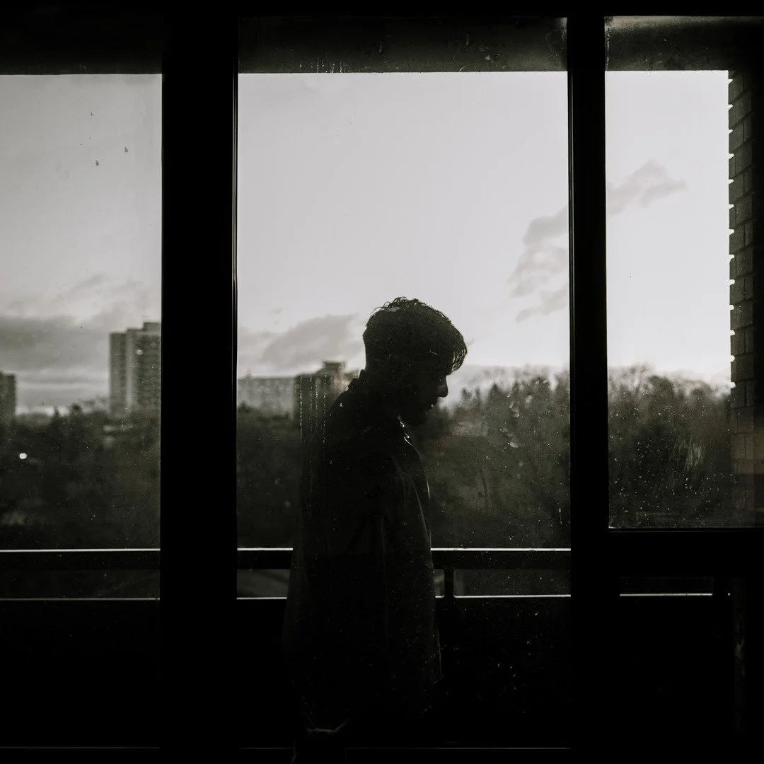 A man with a beard and short hair standing near a window with sunlight casting a shadow of his profile on the wall beside him.