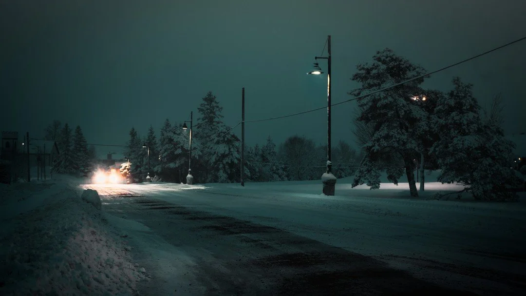 A man and woman standing on a snowy street opposite each other, separated by a lamppost, looking at each other. The man is wearing glasses, a dark coat, and a gray scarf. The woman is wearing a red beret and a black and white checkered coat.