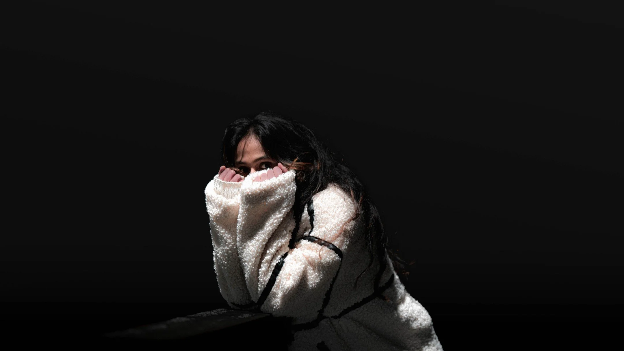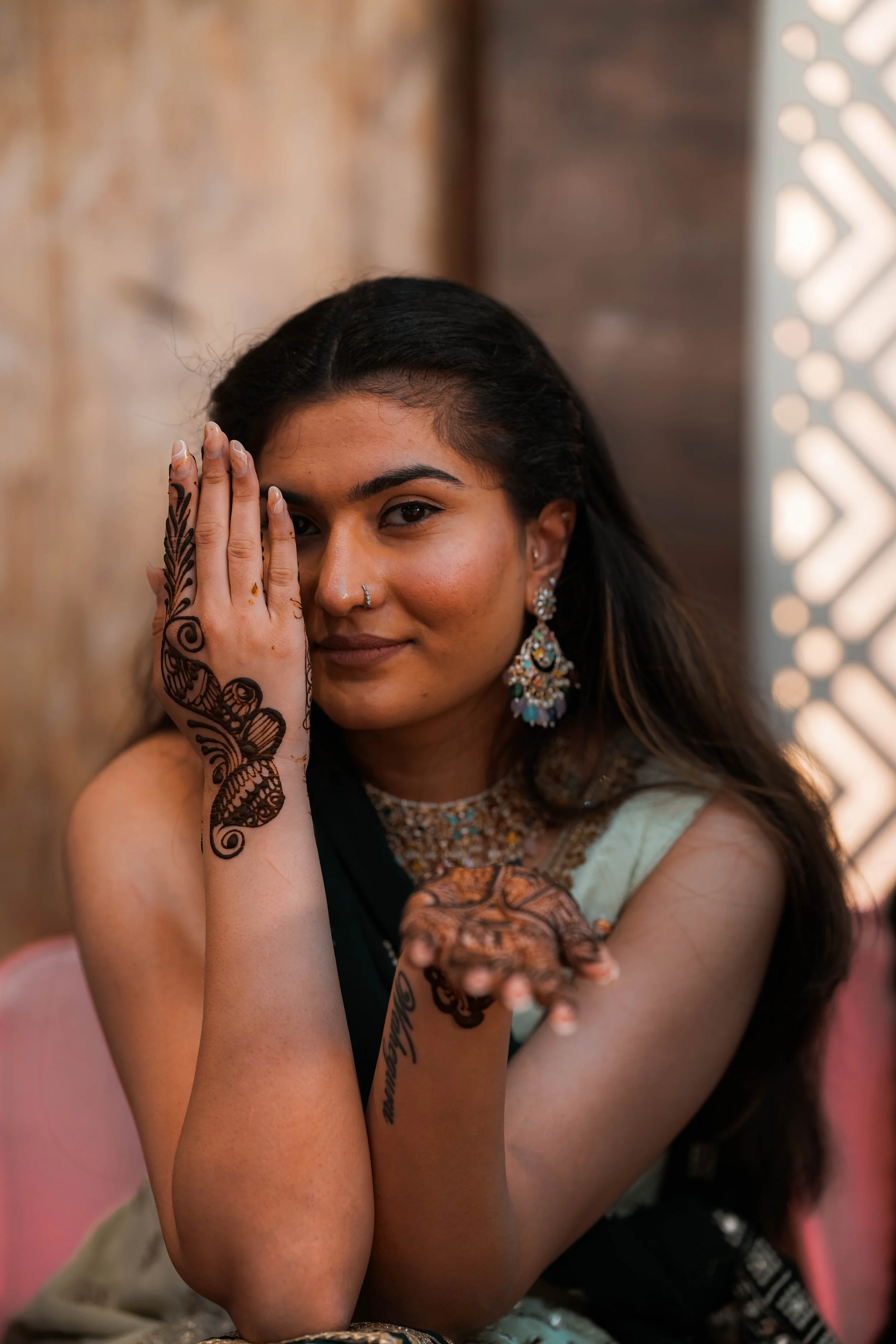 A young woman with dark hair, jewelry, and henna tattoos on her hands, sitting indoors against a wooden and patterned wall, with her left hand covering the right side of her face and her right hand extended in front of her.