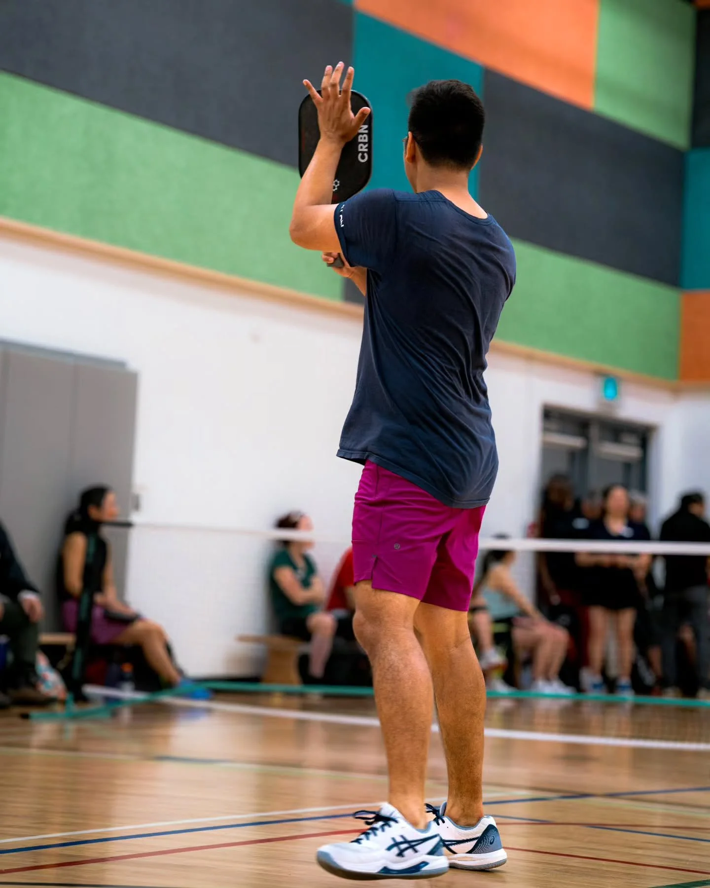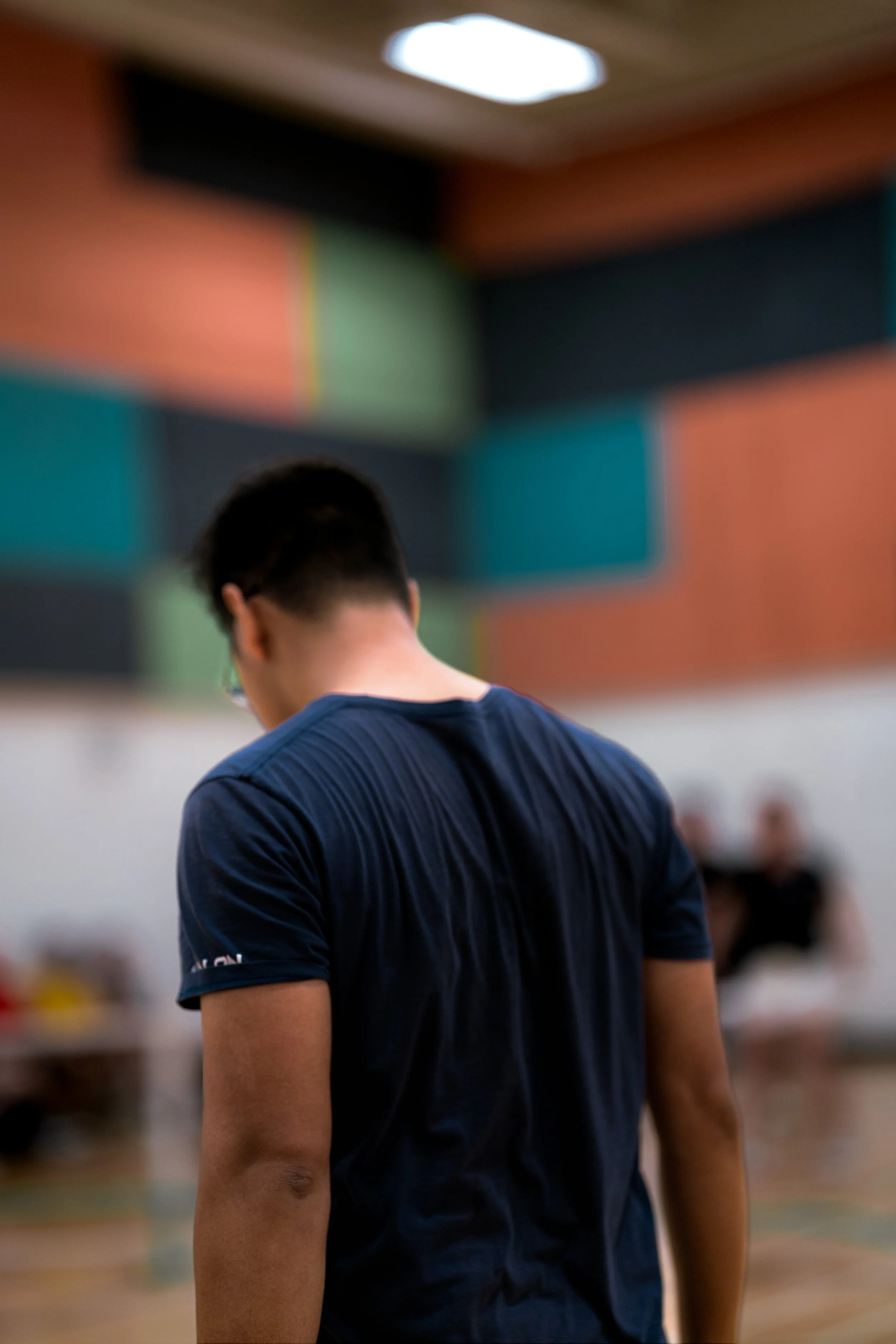 A person with short black hair in a blue athletic shirt, standing with their back to the camera in an indoor gymnasium with colorful padded walls.