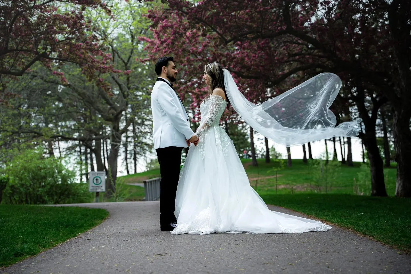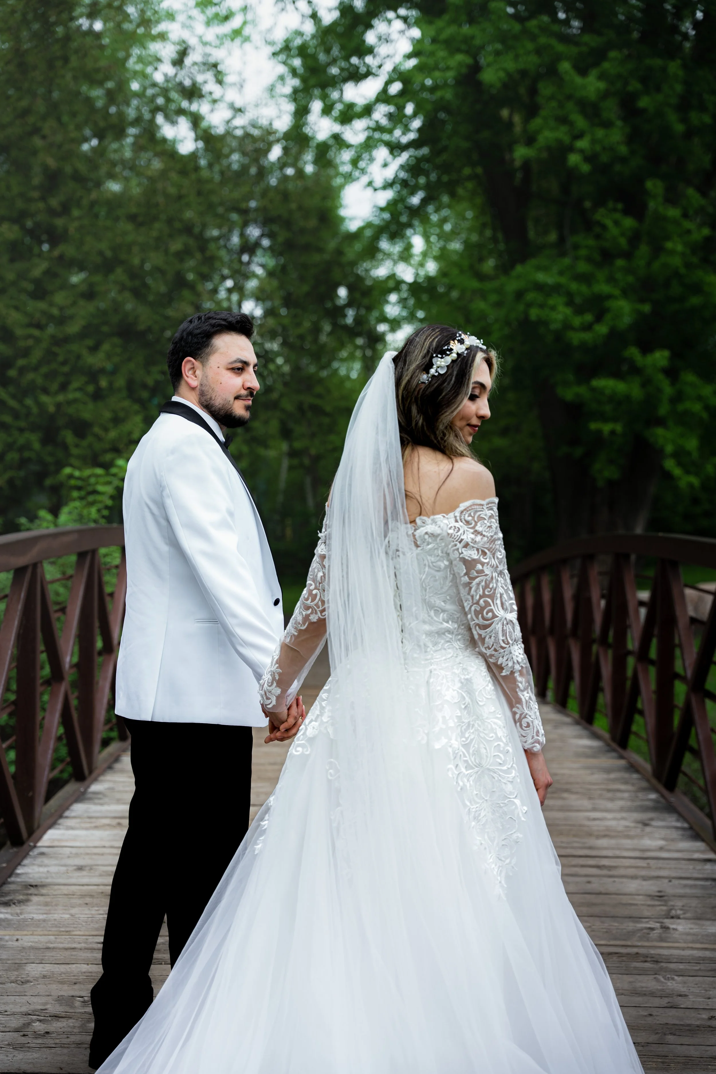 Bride and groom standing hand in hand on a wooden bridge with lush green trees in the background, bride wearing a lace wedding gown and veil, groom in a white tuxedo jacket.