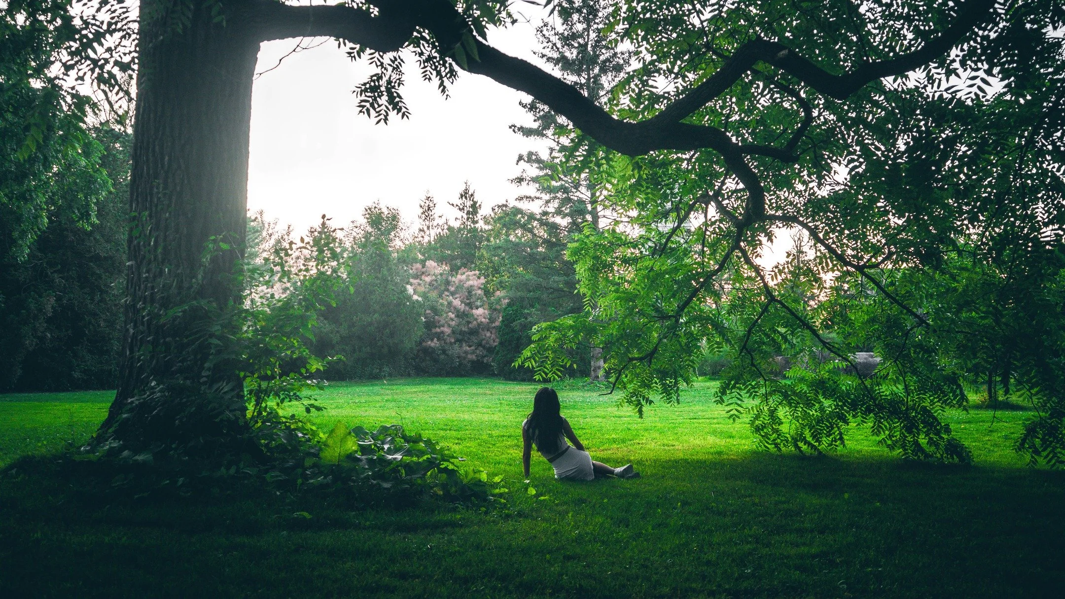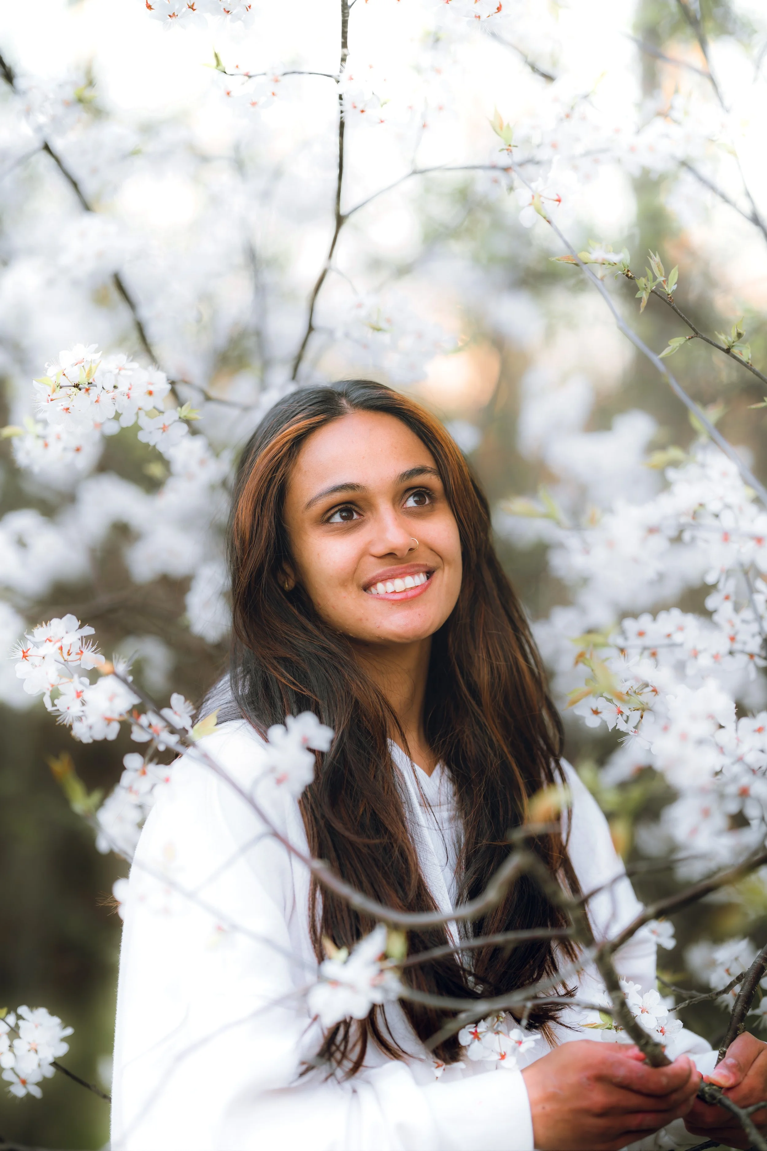 A woman with long brown hair holding a branch of blooming white cherry blossoms, smiling, outdoors.
