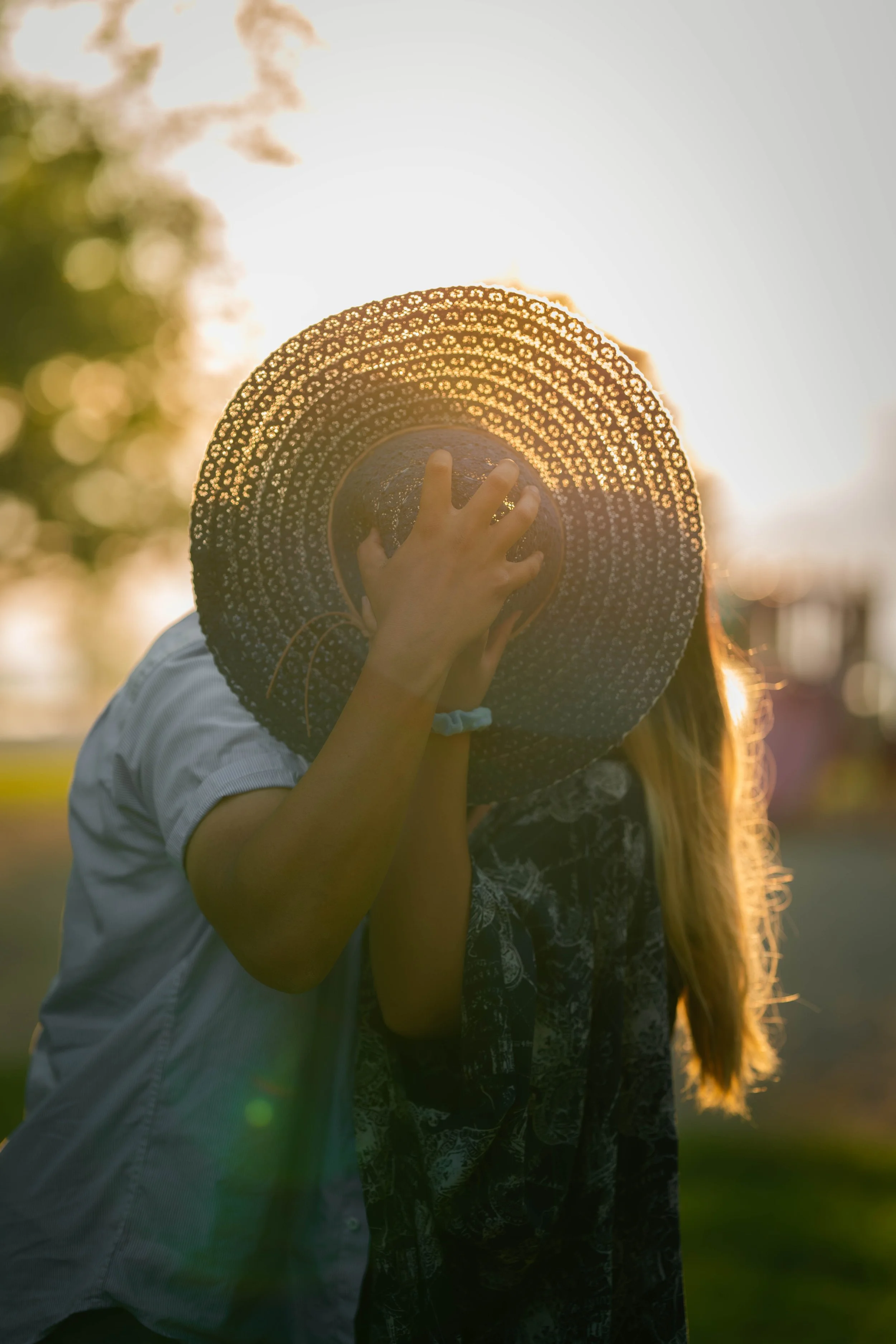 Two children, one wearing a large straw hat, seem to be hiding or playing together outside at sunset.